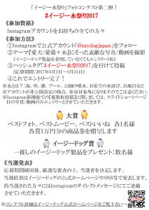 ※以前に投稿されたお写真や動画にてエントリーをされたい場合は、「#イージー水祭り2017」を付けて新たに再投稿をお願いいたします。コンテスト開催期間内の投稿のみ、有効とさせていただきます。