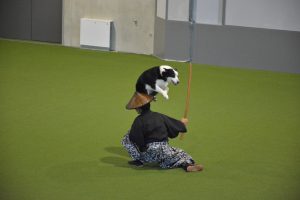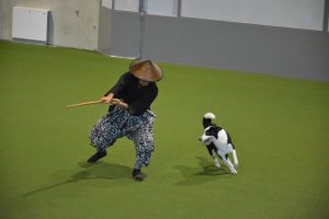 侍に扮した伊藤トレーナーとコテツくん。会場全体を風の如く走り回ったり、居合いをイメージした第迫力の演舞を堂々と披露してくれました。