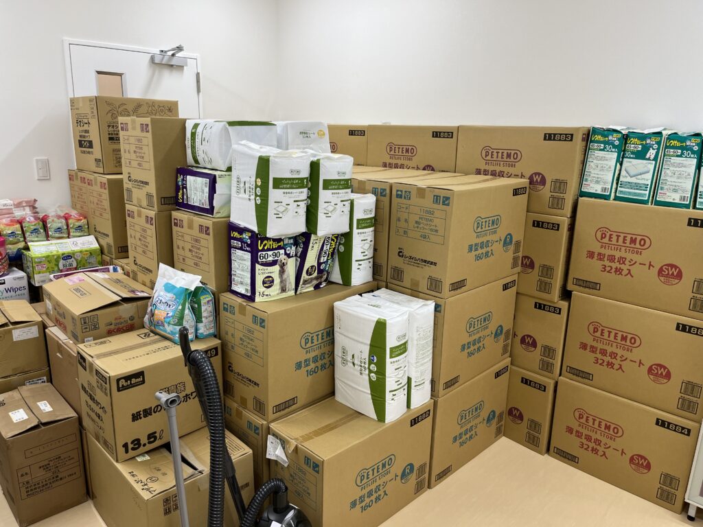 ここでの調査内容としては、支援物資としてペットシーツは豊富であったが、地域柄、猫中心である事情もあり、猫砂が不足していました(図4)。