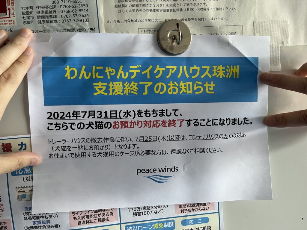 1ケ所目の避難所は、珠洲市生涯学習センター横のピースワンコ様の仮設保護施設のあったペット同伴避難所の飯田公民館に伺いました。