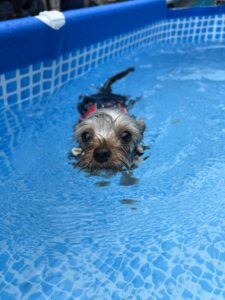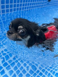 DFDブーストを着用して、小型犬のワンちゃんでも安心安全に水遊びを楽しんでもらいたいと思います。