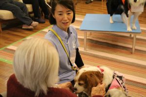触ってもらいやすいようにセラピードッグを近づけたり、時には抱っこしていただいたりします。怖がっている人には、まずは人が声をかけて少しずつ犬との距離を縮めます。