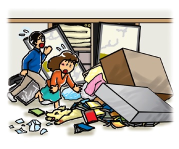 ・タンスや本棚、戸棚などが倒れて物が散乱し避難の支障になる。