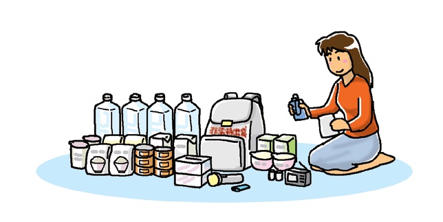 ・ナイフ、缶切、鍋や水筒、懐中電灯、ラジオ、電池、ロープ、マッチやライター、使い捨てのカイロ、ティッシュ類、筆記用具、ごみ袋など