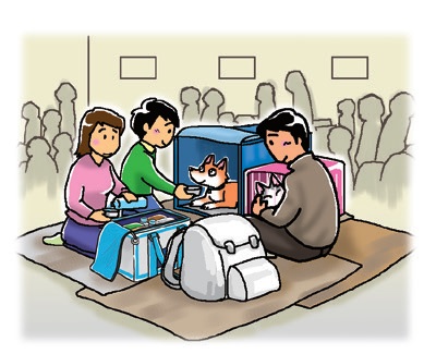 もし、自宅が大地震による損壊や火災で住めなくなったり、水害による浸水などで在宅避難を継続できない場合は、必ず、ペット同行避難を行い、地域防災計画等に基づく、直近の小学校などの指定避難所での生活を行う準備が必要です。
