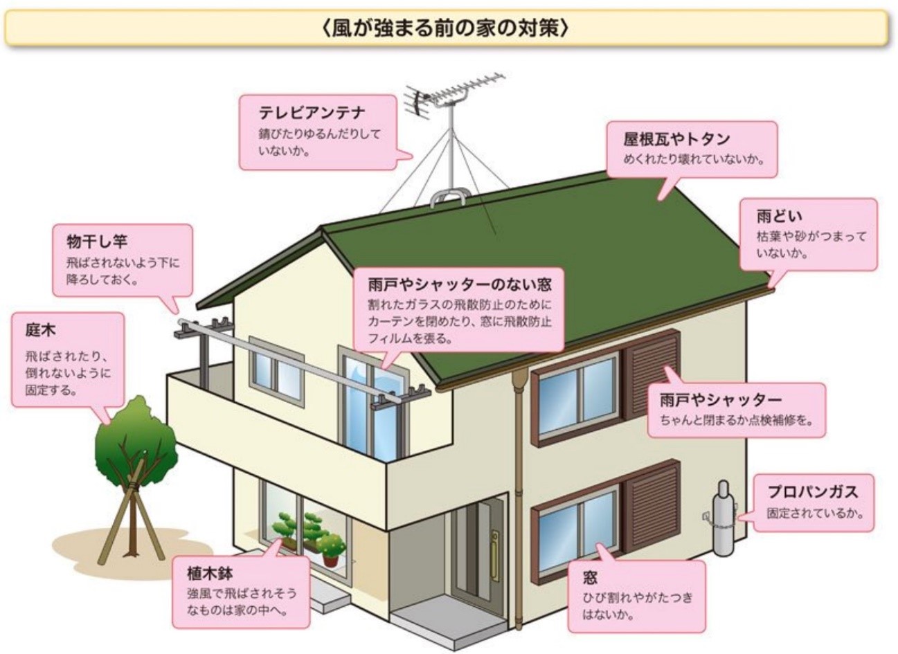 ・テレビアンテナや太陽熱発電パネルが脱落するなどして屋根を壊したり、窓などを割らないようにそれぞれの固定部分が錆びたりゆるんだりしてないかを点検しておく。
