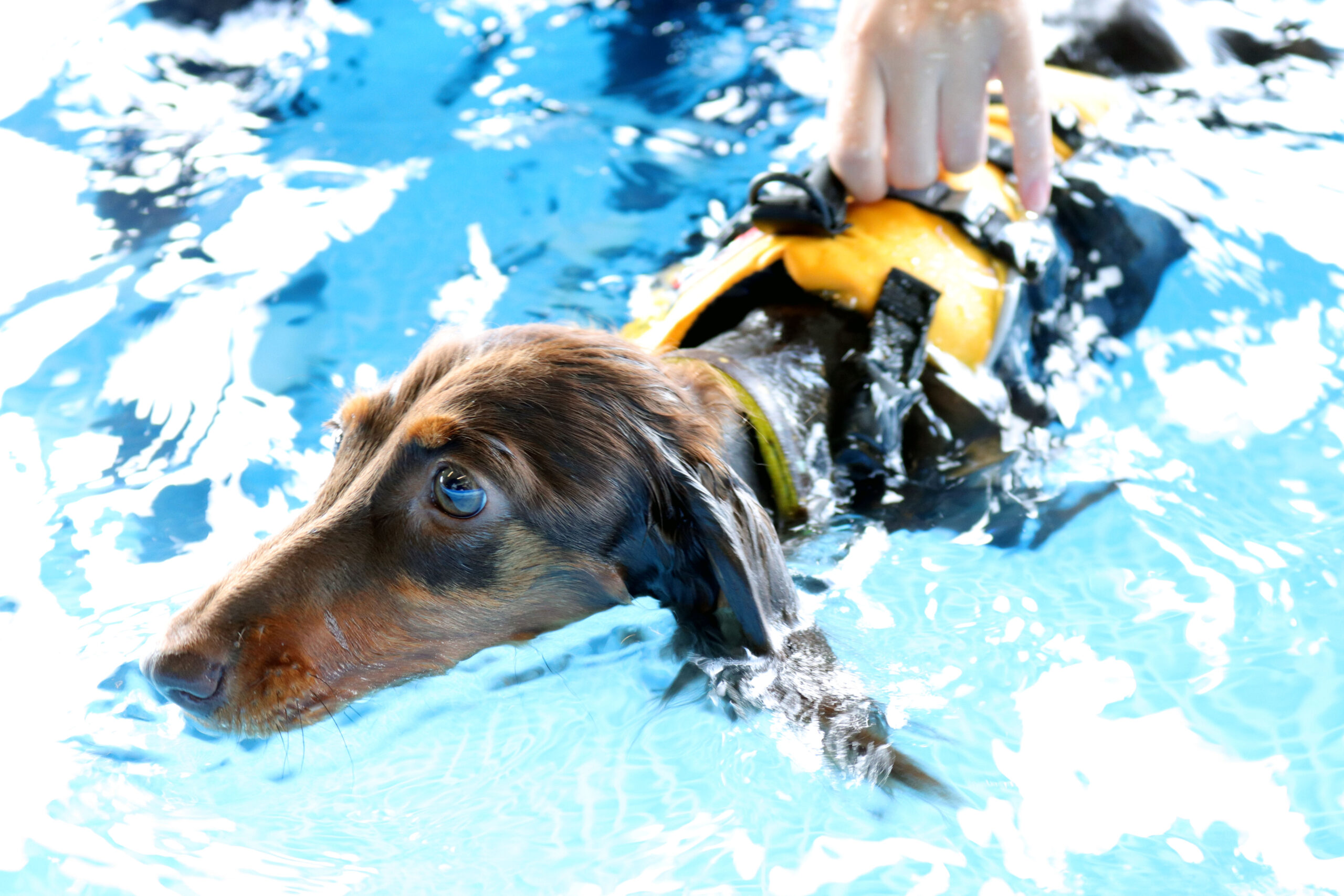 また、水中運動がいくらリハビリに使われているといっても、素人判断で行うのは大変危険です。例えば、小型犬に多い膝蓋骨脱臼という病気がありますが、もし、患部である膝が水面から出るほどの浅い水位で運動させた場合、膝には地上運動よりも更に負担がかかります。水の抵抗や表面張力が足の動きを邪魔するからです。弱っている部分に負荷をかけ過ぎることは病気や怪我を悪化させるリスクがあるので、疾患を持っている犬は、獣医さんとよく相談してから水中運動を行ってください。