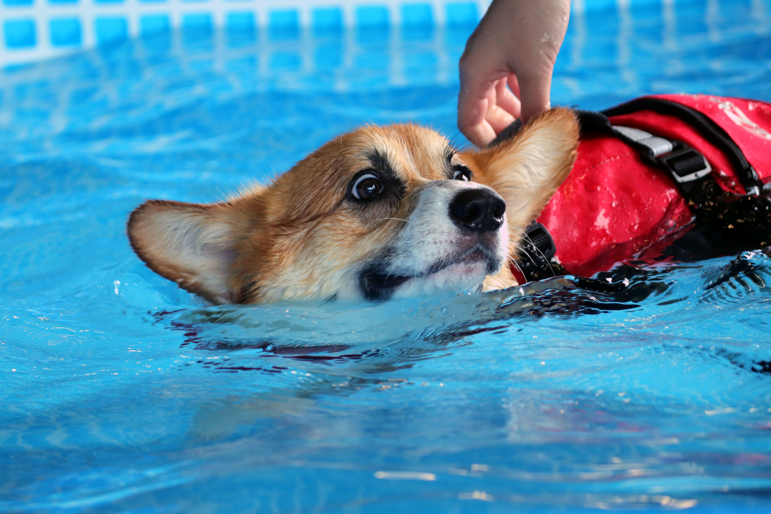 それから、波や流れが無いプールであっても、気を付けないといけないのは犬の体調です。胸が水に浸かる水位でのスイミングや水中歩行では、呼吸が制限されます。顔を浸けて泳ぐ人間と違って、犬の鼻は水面から出ているのにどうして?と不思議に思いますよね。